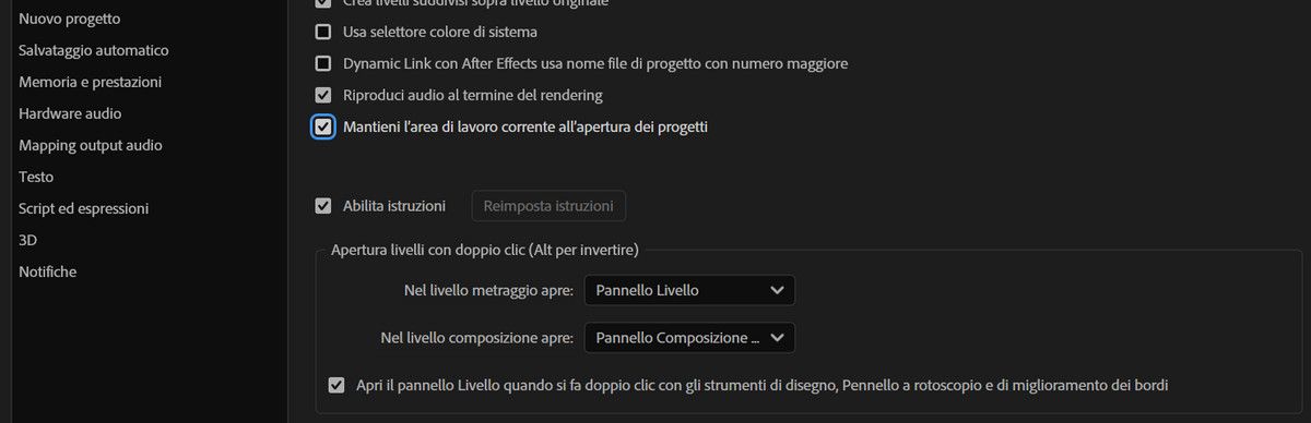 Una nuova preferenza in After Effects consente di mantenere il layout dell’area di lavoro corrente quando si aprono i progetti salvati con un’altra area di lavoro. Attivando l’opzione Mantieni area di lavoro corrente all’apertura dei progetti (Preferenze > Generali > Mantieni area di lavoro corrente all’apertura dei progetti), il layout resta coerente, eliminando la necessità di riorganizzare l’area di lavoro ogni volta che si apre un nuovo progetto. In questo modo, l’area di lavoro rimane invariata, a prescindere dal progetto su cui stai lavorando.