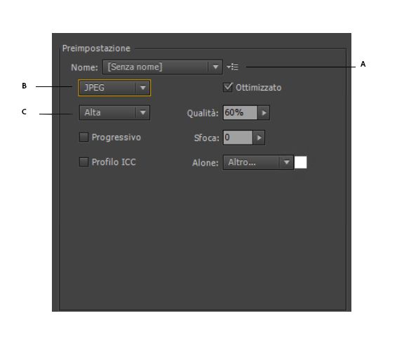 - (GIF e PNG-8) Per mantenere trasparenti alcuni pixel e fondere quelli semitrasparenti con un colore, selezionate Trasparenza e un colore alone.