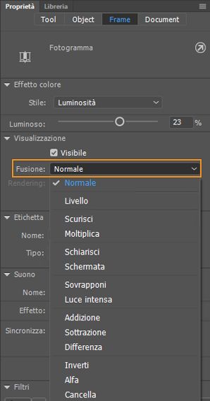 Per applicare i metodi di fusione a uno specifico fotogramma, selezionate il fotogramma e scegliete un metodo di fusione tra quelli elencati nella sezione Visualizzazione del pannello Proprietà fotogramma.