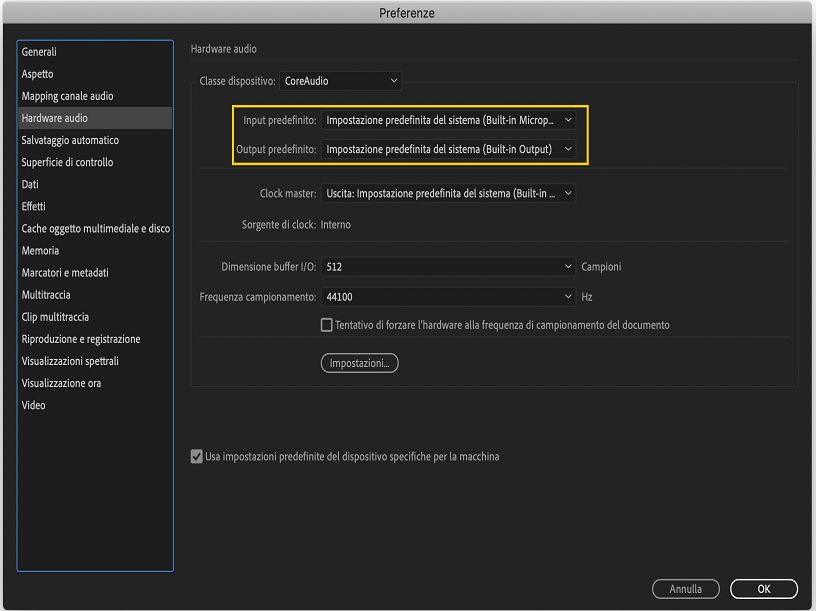 Seleziona Impostazione predefinita del sistema quando selezioni i dispositivi di input e output audio in Audition per utilizzare il dispositivo attualmente usato dal sistema operativo. Il dispositivo cambierà automaticamente quando vengono collegati o connessi nuovi dispositivi. Questa funzione è disponibile anche in Premiere Pro, After Effects, Character Animator, AME e Premiere Rush in macOS.