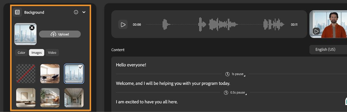 L'accento scelto nella sezione Contenuto è l'inglese. È stato aggiunto un paragrafo come dialogo scritto per l'avatar.