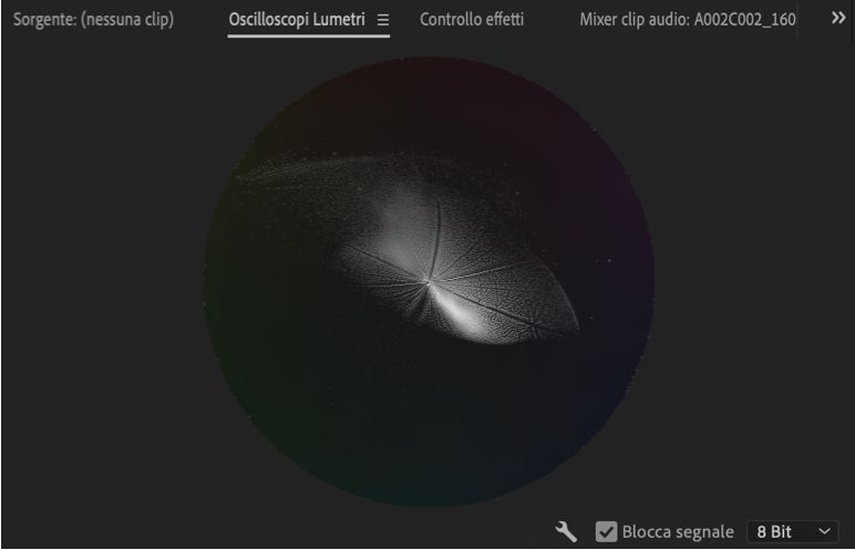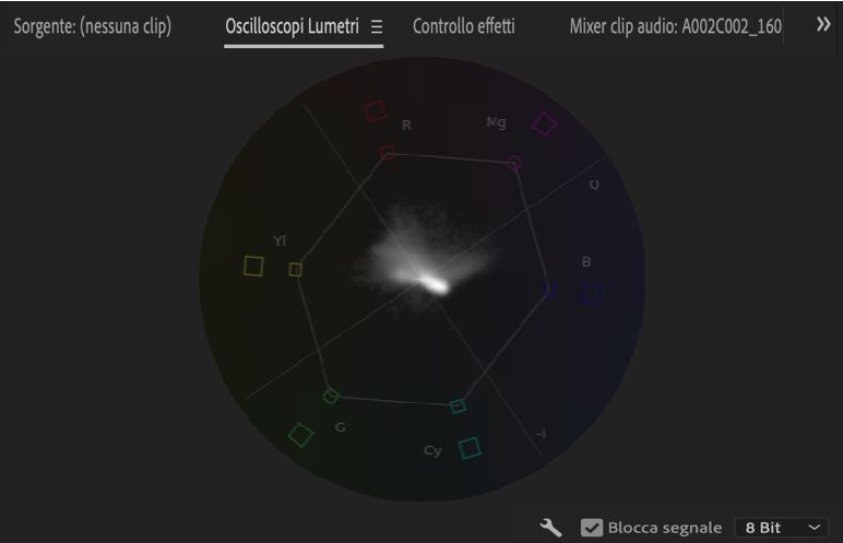Premiere offre due diverse versioni di vettorscopio: YUV e HLS (Tonalità, Luminosità e Saturazione).