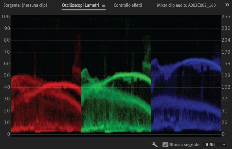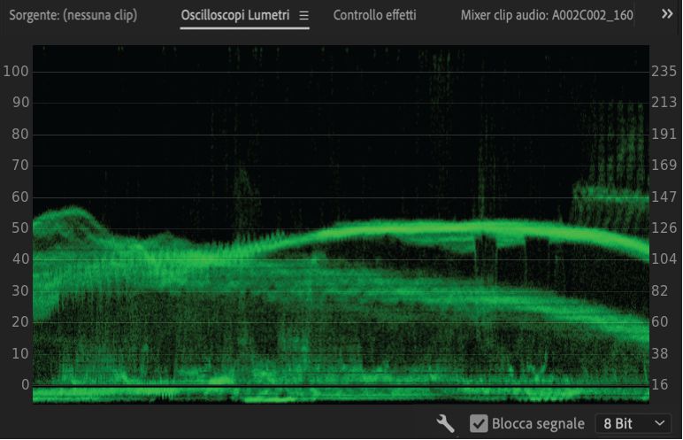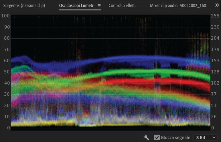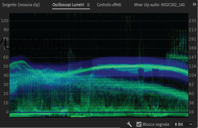 Mostra i valori di luminanza (in verde nella forma d’onda) e di crominanza (in blu) della clip.