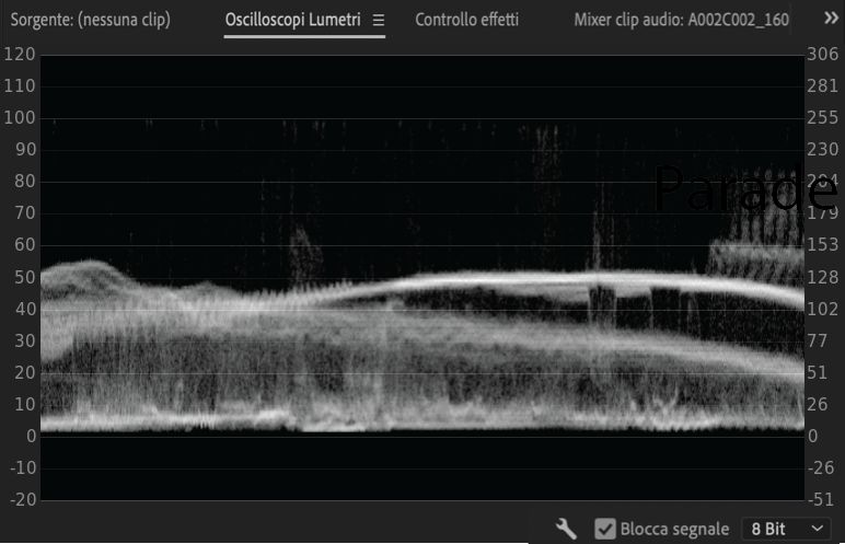 Seleziona Blocca segnale se desideri ritagliare qualsiasi segnale visualizzato negli ambiti superiore a 100 IRE o inferiore a 0 IRE. Blocca segnale incide solo sull’output nella finestra scope Lumetri. Il bloccaggio dell’oscillometro non influisce sul rendering del fotogramma sulla linea temporale o sull’esportazione dell’output.