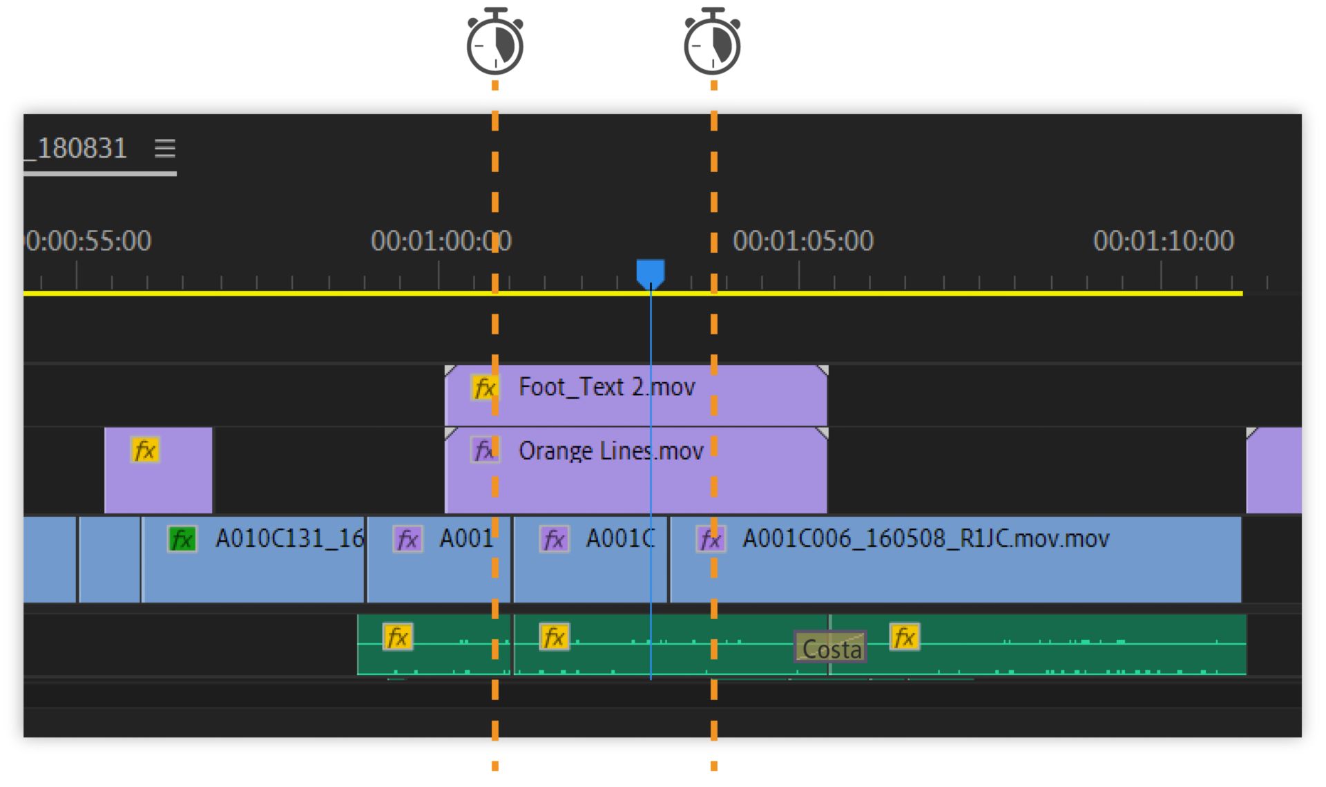I monitor Sorgente e Programma contengono una serie di controlli molto simili ai comandi di riproduzione di un videoregistratore. Con i controlli del monitor Sorgente puoi riprodurre o impostare l’inizio di una clip. Con i controlli del monitor Programma puoi riprodurre o visualizzare la sequenza attiva.