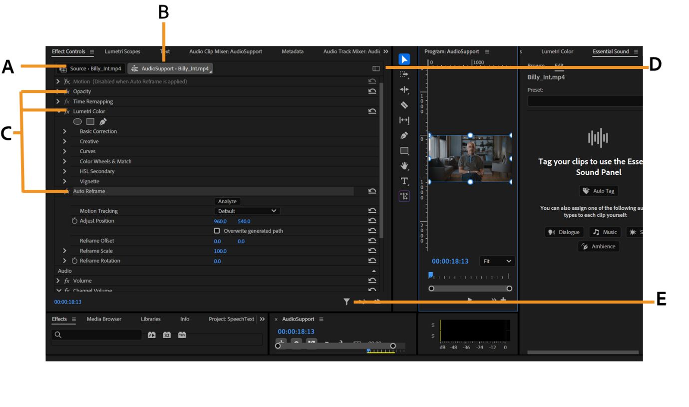 A.Nome della sequenza B.Nome della clip C.Effetti D.Opzione Mostra/Nascondi vista timeline E.Opzione Filtro proprietà