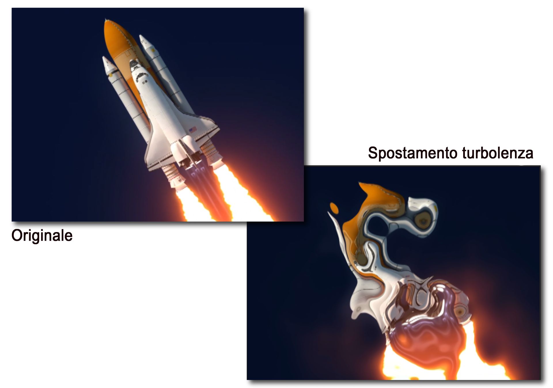 L’effetto Spostamento turbolenza utilizza un disturbo frattale per creare distorsioni turbolente nell’immagine. Ad esempio, utilizzalo per creare effetti di acqua corrente, di riflessi in una casa degli specchi e di bandiere al vento.