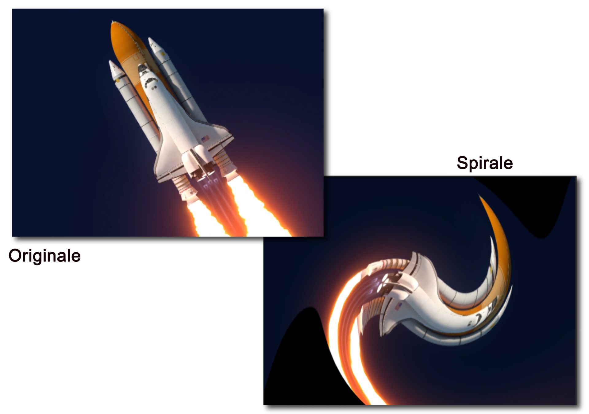 L’effetto Spirale distorce un’immagine ruotando una clip attorno al suo centro. L’immagine viene distorta in modo più deciso al centro rispetto ai bordi, causando un effetto mulinello con impostazioni estreme.