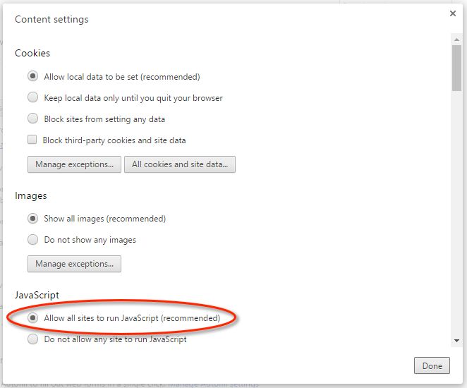 「すべてのサイトで JavaScript の実行を許可する」が選択されていることを確認し、「完了」をクリックします。