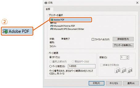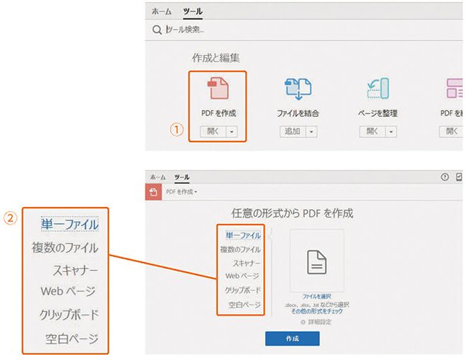 Acrobatを起動して、「ファイル」→「作成」→「WebページからPDF」を選択します。「WebページからPDFを作成」ダイアログが開くので、PDFに変換したいWebページのURL①を入力します。
