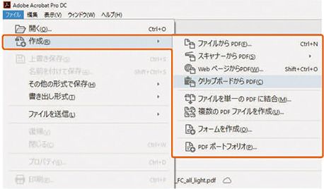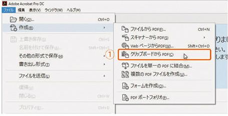 2 Acrobat を起動し、「ファイル」→「作成」→「クリップボードからPDF」①を実行します。