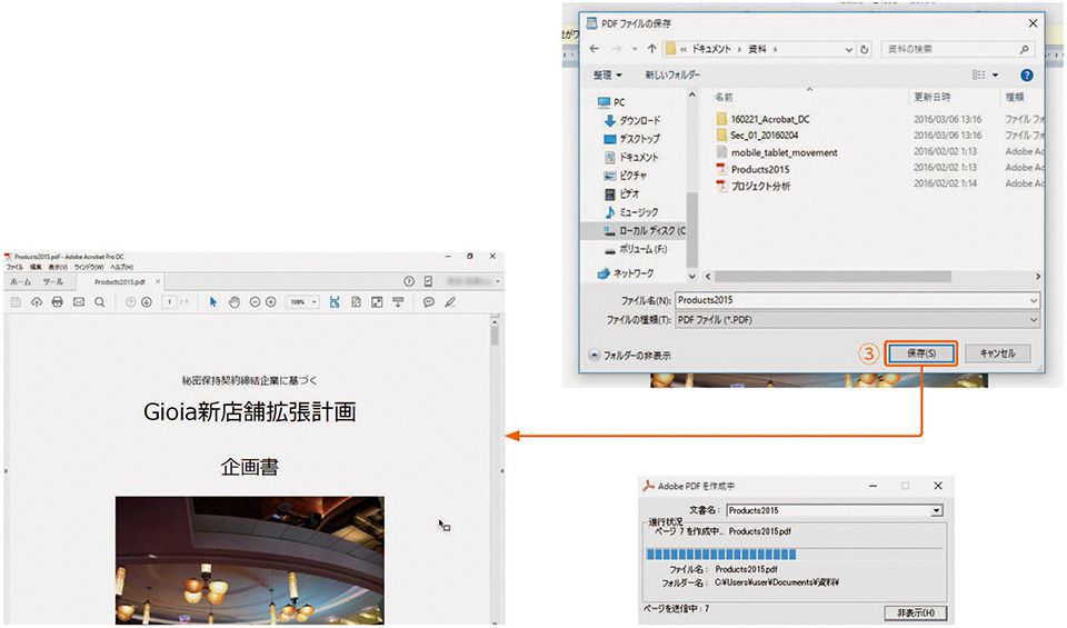 「作成」ボタンをクリックすると、読み込みが開始され、変換が完了すると指定したページがAcrobatで開かれます。