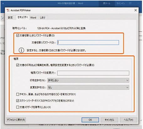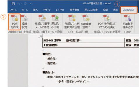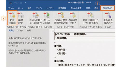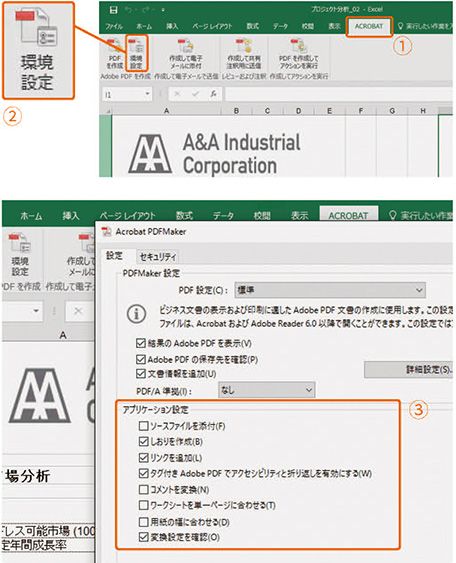 PDFに変換したいファイルを開き、「Acrobat」リボン①から「環境設定」②をクリックして、「Acrobat PDFMaker」ダイアログを表示します。
