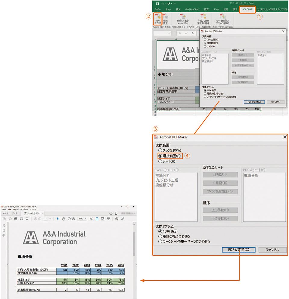 PDFに変換したいファイルを開き、「Acrobat」リボンから「PDFを作成」をクリックします。「Acrobat PDFMaker」ダイアログが表示された状態で「シート」① にチェックを入れます。変換したいシートを左側の「Excelのシート」②の中から選択し、中央の「選択したシート」にある「追加」③をクリックして右側の「PDFのシート」へ追加します。シートの選択が完了したら、「PDFに変換」をクリックすると、選択したシートがPDFに変換されます。