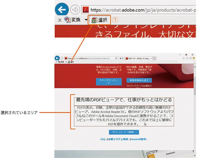1 Internet Explorerを起動し、PDFに変換したいWebページを開きます。「選択」ボタン①をクリックして選択機能をオンにします。