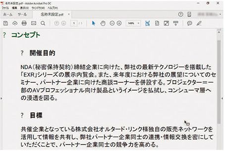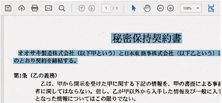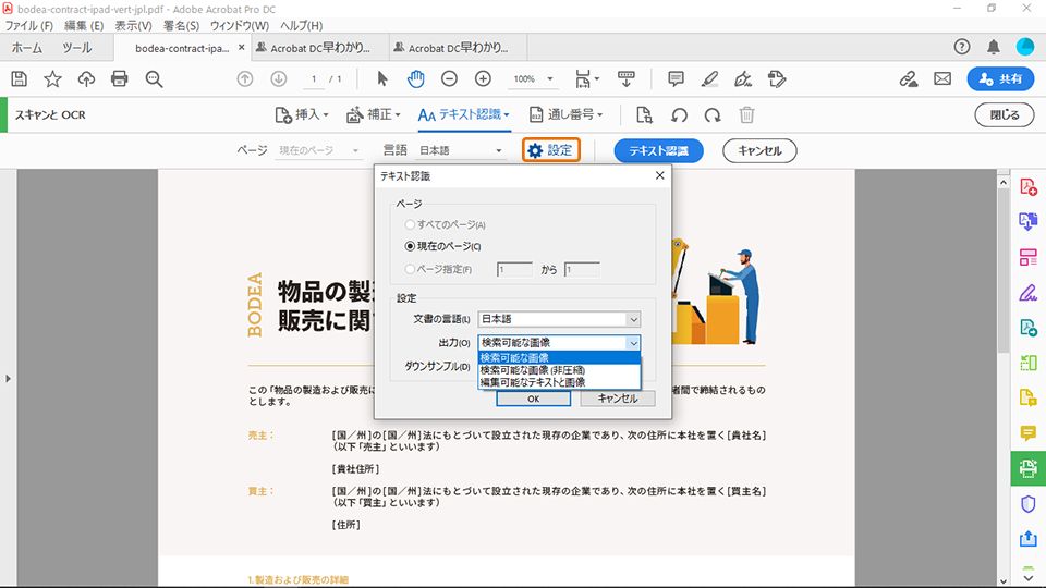 通常、画像を貼り付けたPDFでは、文書内容に従って検索をしたり、しおりを設定することはできませんが、Acrobat から直接文書をスキャンし、テキスト認識を実行することで、画像からテキストへの変換を行うことができます。