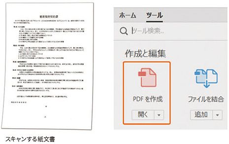 すでにスキャンしてあるファイルや画像形式のファイルを、Acrobat がテキスト認識を行い、検索可能なPDFに変換します。