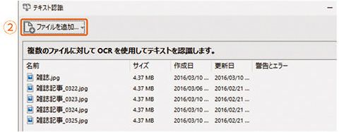 2 複数のファイルを選択するためのダイアログが表示されるので「ファイルを追加」②をクリックし、テキスト認識を行いたいファイルをまとめて選択し、「OK」をクリックします。
