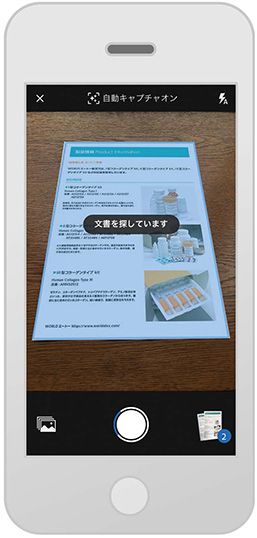 2 位置を調整すると、「文書をキャプチャしています…動かさなでください」①と表示され、位置が決定すると自動でシャッターボタンが押されます。撮影した写真のサムネール②が表示されるので、タップして開きます。写真の余分な部分が自動的に削除され、ゆがみも補正されます。
