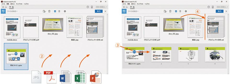 Acrobat では、既存のPDFやWord、Excel、画像など、各種のファイルを1つにまとめ、ページの連続した単一のPDFに結合することができます。ファイルの形式やページサイズ、ページ数、縦横を気にすることなく、1度の操作で結合できます。結合の際または結合後に、ページの順番を入れ替えることも可能です。