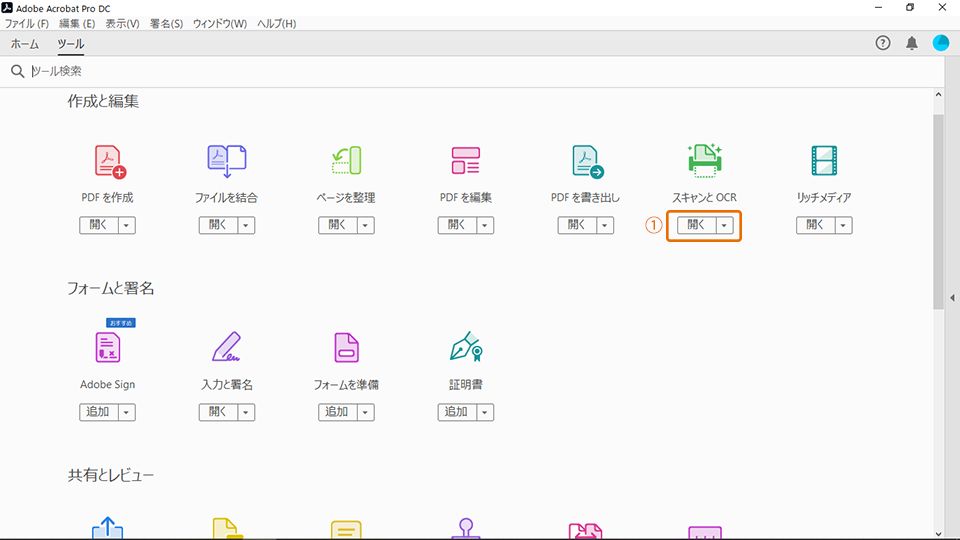1 Acrobatを起動し、文書が何も開かれていない状態で「ツール」タブをクリックし、ツールセンターを表示します。その中から「スキャンとOCR」を選び、「開く」①を選択します。