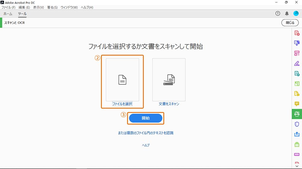 1 Acrobat を起動し、文書が何も開かれていない状態で「ツール」タブをクリックし、ツールセンターから「スキャンとOCR」を選択します。「スキャンとOCR」ページ下部にある「または複数のファイル内のテキストを認識」①をクリックします。