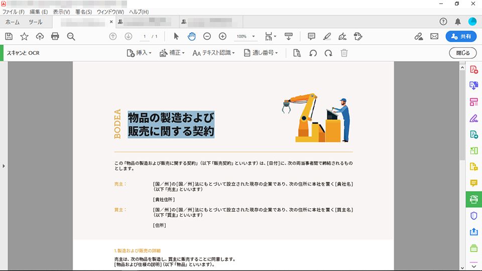 Acrobatでは、スキャナーからの文書を読み込み、OCRによるテキスト認識、PDFへの変換が同時に行えます。紙文書をPDF化することで保管スペースや管理コストが削減できるだけでなく、検索や編集、流用も可能な情報資産として管理できます。