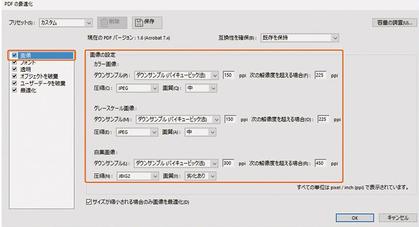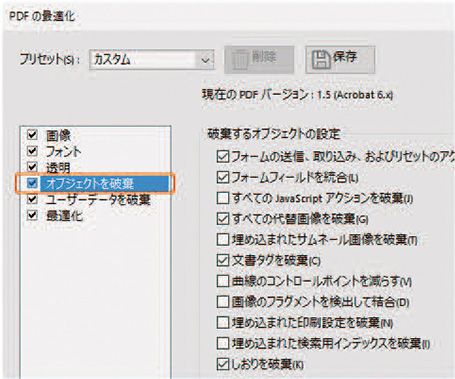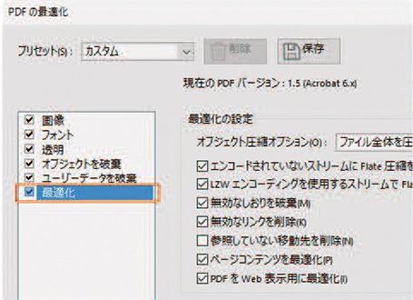 PDF内で無効になっている情報を破棄したり、さまざまなオブジェクトの圧縮率を変更することでファイルサイズを小さくすることができます。