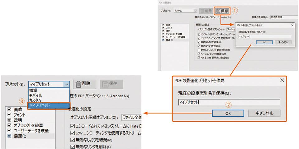 「PDFの最適化」で行った設定はプリセットとして保存することができ、別のPDFに対して同じ設定を1ステップで適用できます。