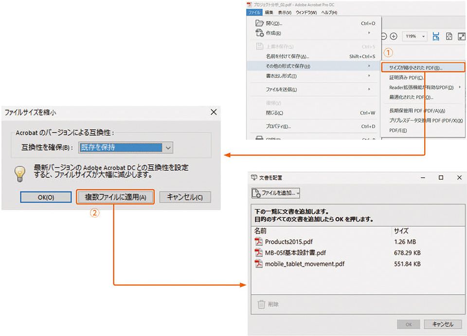 また「複数ファイルに適用」②をクリックすると、一度に複数のPDFに対して、ファイルサイズの縮小を実行することができます。