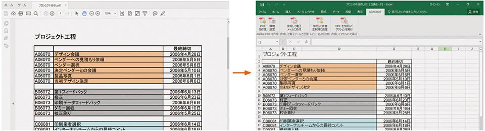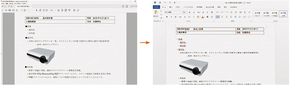 Acrobatを使用して変換したPDFは、Acrobatから他のファイルフォーマットに書き出すことが可能です。手元に原本が存在せずPDFしかないという場合でも、コンテンツを簡単に再利用できます。