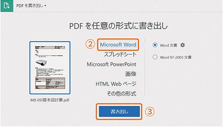 2 次の書き出し画面で「Microsoft Word」②を選択し、「Word文書」か「Word 97- 2003文書」を選びます。「書き出し」③をクリックし、保存場所とファイル名を指定して保存します。
