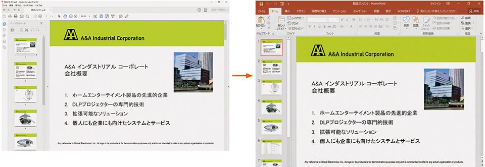 PDFを簡単に編集可能なPowerPoint形式に保存することができます。PDFのページが書式やレイアウトを保持したままPowerPointのページとして変換されます。