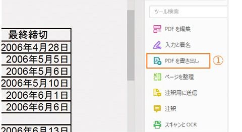 1 PDFを開き、ツールパネルウィンドウの「PDFを書き出し」①クリックします。