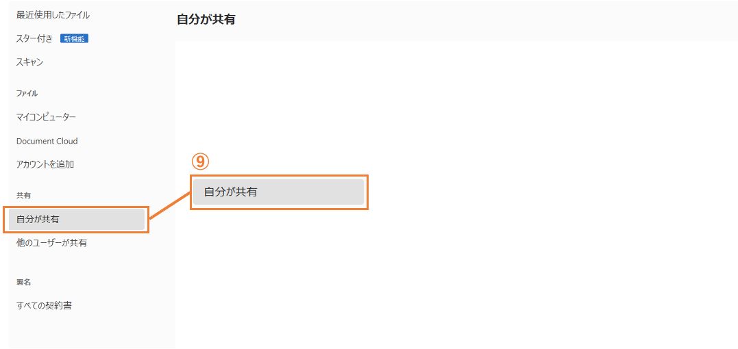 5 送信者はAcrobatで、送信済みファイルをトラックすることができます。「ホーム」タブをクリックし、「共有」→「自分が共有」⑨を選択すると、共有したファイルがリストに表示されます。ファイルを選択すると、画面の右にファイルの情報が表示されます。⑩