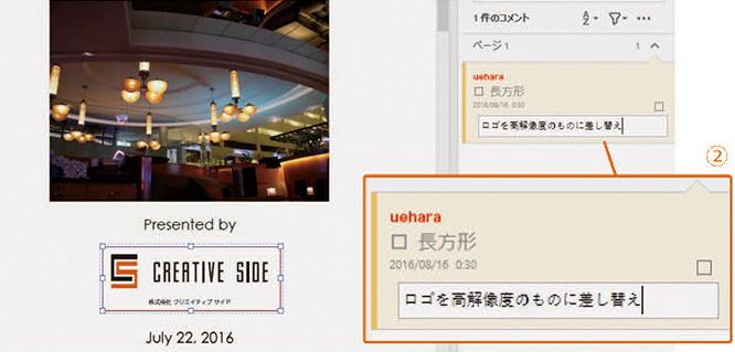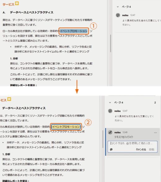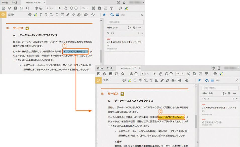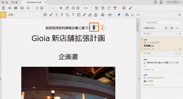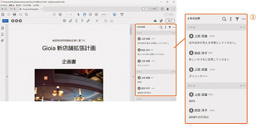 2 PDFに他のレビュー担当者の注釈が読み込まれてリスト表示され、内容を確認することができます。②