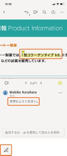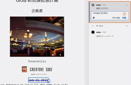 注釈に対してコメントを返信することができます。レビュー担当者からの意見や疑問に答えるためのコメントを入力します。