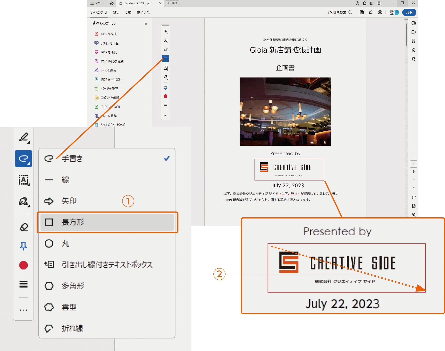 1 長方形を追加するには、「注釈」のツールバーから「長方形を描画」①を選び、長方形を追加したい場所でマウスをドラッグします。