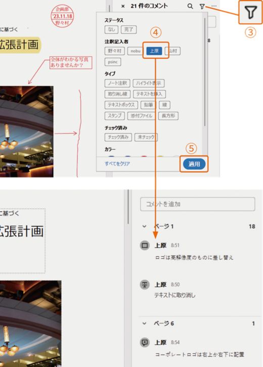 3 注釈のカテゴリをフィルタリングをすると、選択したカテゴリの注釈のみが表示されます。注釈リストパネル上部にある「注釈の絞り込み」メニューから目的のカテゴリを選びます。たとえば、特定の作成者を選択すると③、その担当者の注釈のみが表示されます。