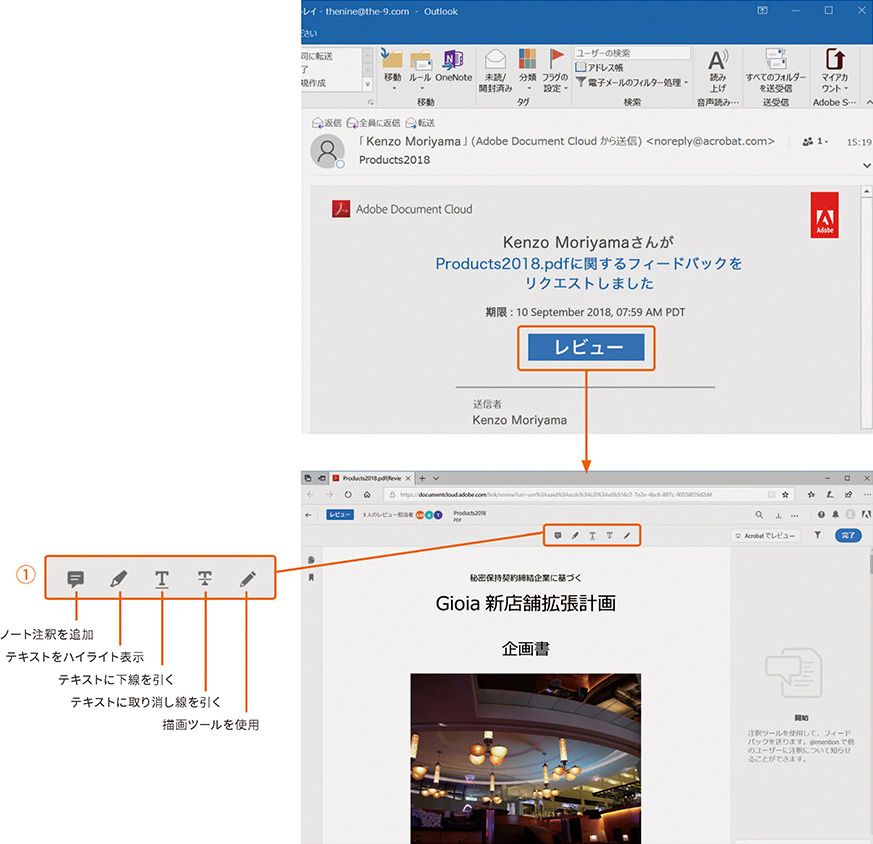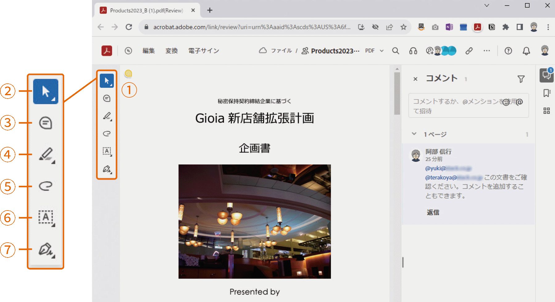 2 ブラウザーが起動し、共有レビュー用のPDFが開きます。共有レビュー用の注釈ツール①を利用して、すぐにレビューを開始することができます。