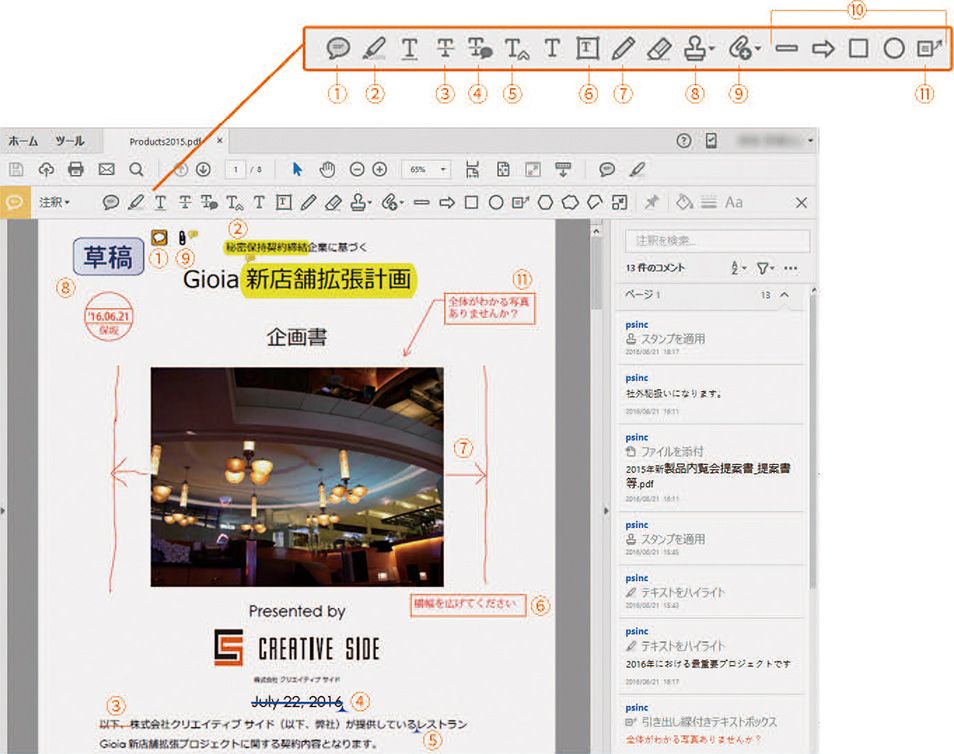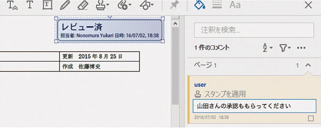 レビュー担当者は、レビュー用に送信されたPDFに対して、注釈ツールを使って注釈やコメントを追加し、結果を他のレビュー担当者と共有することができます。