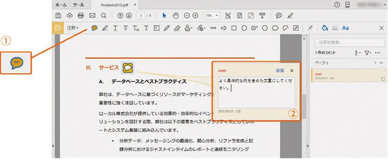 3 注釈を追加すると、デスクトップ版Acrobatと同様に右のリストに表示され、「投稿」②をクリックすると注釈がDocument Cloudにアップロードされます。