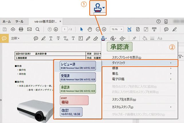 1 「注釈」のツールバーから「スタンプを追加」①を選択し、プルダウンメニューの中から「電子印鑑」②を選択すると、電子印鑑の種類を見ることができます。