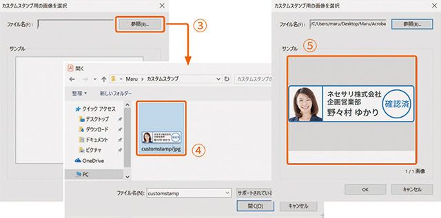 2 「カスタムスタンプ用の画像を選択」画面で「参照」③をクリックし、あらかじめ作成しておいたオリジナルのスタンプを撰択④します。「サンプル」⑤で確認したら、「OK」をクリックして登録します。