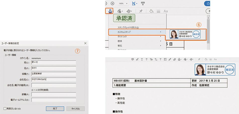 3 ツールバーから「スタンプを追加」→「カスタムスタンプ」を選択すると、登録されたカスタムスタンプが表示されます⑥。最初に使用するときに「ユーザー情報の設定」画面⑦が表示されるので、必要な情報を入力して「完了」をクリックします。ドキュメント上の任意の場所をクリックし、ドラッグして大きさを指定するとカスタムスタンプを追加できます。