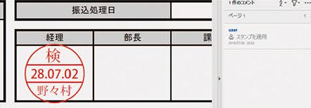 3 電子印鑑を追加したい場所でクリックすると、ユーザー情報に基づくユーザー名と日時を含んだ電子印鑑が追加されます。