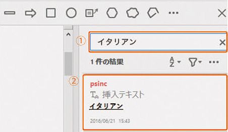 1 注釈リストパネルにある「注釈を検索」にキーワードを入力①すると、該当する注釈のみが一覧に表示され、PDF上でも該当する注釈②のみが表示されます。