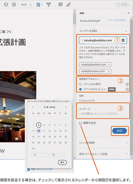 「共有」を使用すると、ファイルは自動的にDocument Cloudにアップロードされ、複数のユーザーにファイルのリンク先をメールで送信することができます。受信者がファイルにアクセスすると、送信者にはメールで通知が届きます。