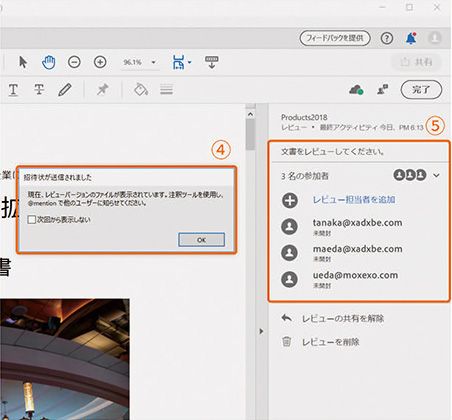 3 Document Cloudにレビュー用のファイルが生成され、レビュー担当者に招待状が送信されたメッセージ④が表示されます。ツールパネルウィンドウは、レビューが開始された状態⑤になります。