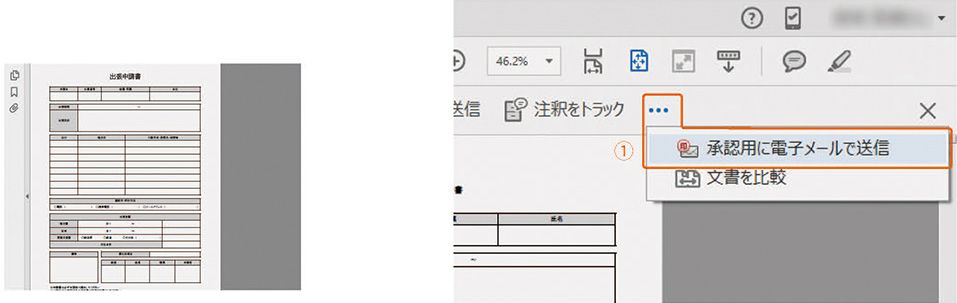 1 ツールセンターから「注釈用に送信」を選び、ツールバーのオプションメニューから「承認用に電子メールで送信」①を選択します。
